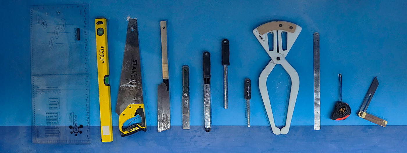 Ciertos instrumentos se revelan INDISPENSABLES para la etapa del "shape" de su tabla de surf. Entre éstos: uno surform, un cepillo manual para costilla, algulos"sanding screens", hojas abrasivas, shaping blocks de diferentes densidades, una sierra, instrumentos de medida.